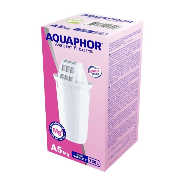 Replaceable module Aquaphor A5 Mg+ complexly purifies tap water from harmful impurities and after enriches water with magnesium and calcium up to 30% of the recommended daily value. Cartridge designed for 350 liters of clean, tasty, mineralized water, beneficial for blood vessels and the heart. Replaceable module removes chlorine and its compounds, rust, heavy metals and other toxins, makes water safe and pleasant to taste. Purified water don't forms scale, which protects household appliances from overheating and breakdowns.