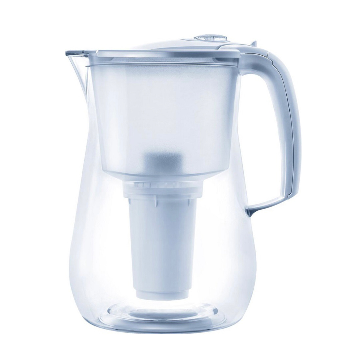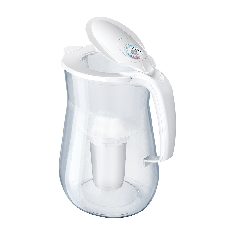Convenient water filter jug made from shockproof and glass-looking material, it's lightweight and incredibly durable. Water jug willn't break even if kid drops it on the floor, which is notable for families with small children. Withstands everyday usage retaining its shiny look. Jug have round bottom and is more stable than conventional filter jugs. Mechanical filter life counter on cover helps track replacement time of filter, which can be easily reset when replacing module.