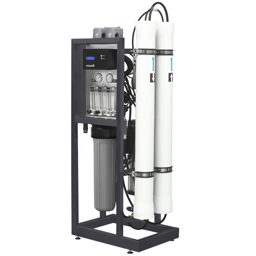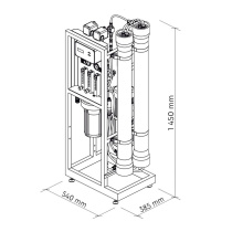 The system is suitable for small and medium-sized businesses, small manufacturing facilities, HoReCa, and private use. It does not require a separate room; its compact footprint measures 1450 x 540 x 385 mm. Its design significantly simplifies maintenance and replacement of replaceable modules. The built-in controller displays all operating information and helps regulate system on/off, automatic membrane flushing, and complete shutdown in emergency situations.