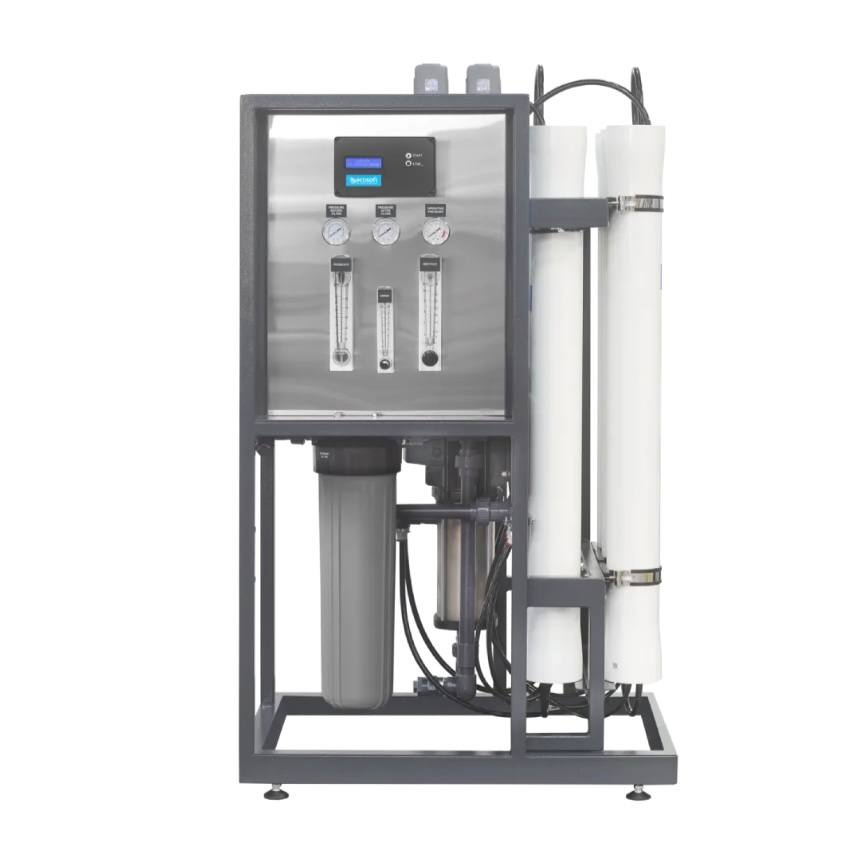 A high-performance industrial reverse osmosis system capable of operating from a standard 230V power supply, designed for water treatment in mid-sized businesses. Its sophisticated design with ample power reserves makes this model the ideal solution for manufacturing facilities, factories, greenhouses, farms, and other medium-sized enterprises where purified water quality is critical. A special American-made membrane neutralizes up to 99% of all bacteria and viruses that may be present in the source water. Convenient permeate flushing and mixing unit options allow the system to handle any water treatment task, even with challenging water. The output water is purified to the same level as bottled water. This also extends the lifespan of the membrane elements by up to 30% and significantly reduces the load on the pre-filters.