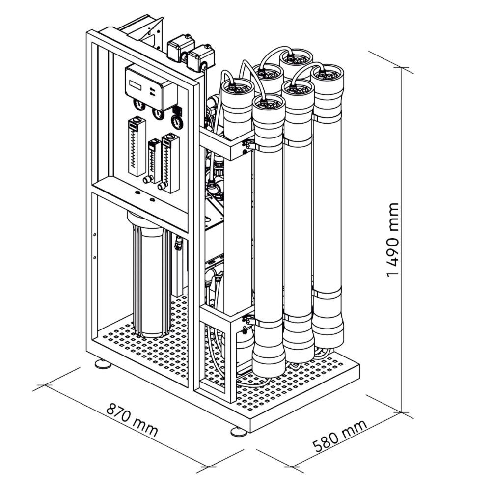 It does not require a separate room; the system is very compact – 1490 × 870 × 580 mm. The system's design significantly simplifies maintenance and replacement of replaceable modules. The built-in controller displays all operating information and helps regulate system on/off, automatic membrane flushing, and complete shutdown in emergency situations.