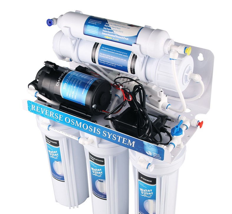 Six-stage RO system with high-pressure pump and 3.2G -12l storage tank. Suitable for large water consumption. Cleans up to 125 gallons per day, more than 560 liters.