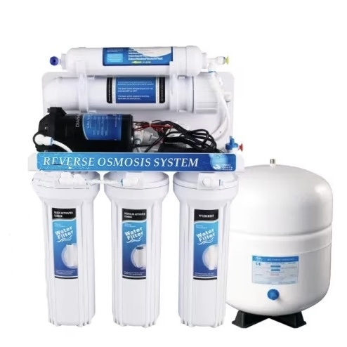 Six-stage RO system, with external 12-liter storage tank and a high-pressure pump.