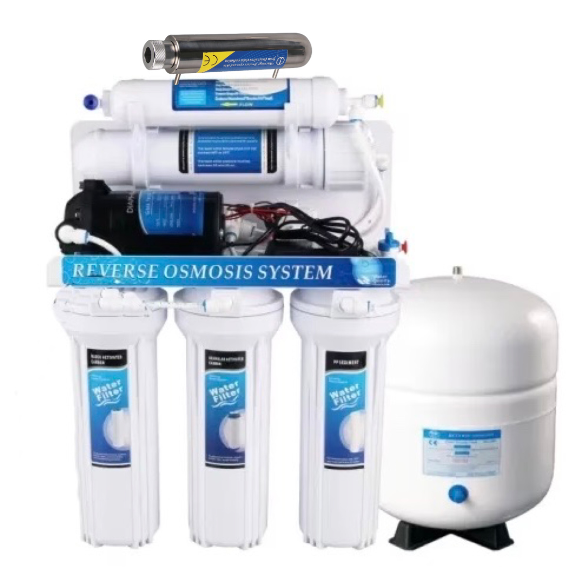 Six-stage reverse osmosis system with UV-filtration and a 13-liter storage tank.