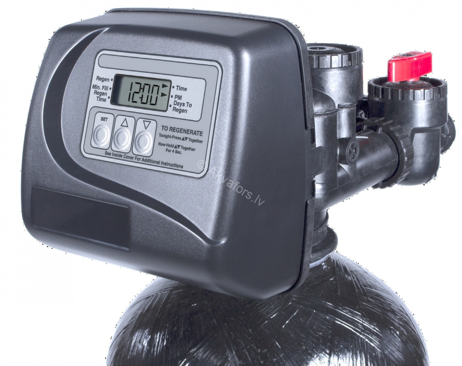 The control valve Clack WS 1 TC is automatic for filters with a connection diameter of 1 ". The diameter under the water pipe is 1.05". Landing thread - 2.5 ". It is delivered in two modifications: DT - reagent and BTZ - reagent-free. Reagent valve Clack WS 1" TC (V1TC-DT) has a reagent line 3/8 for connecting a salt-dilution tank, connection of a flow meter - not provided. Only a downward flow of reagent during flushing is possible. Clack WS 1 "TC valveless valve (V1TC-BTZ) is a three-cycle valve (default), and is used on de-ironers, clarifiers, and filter filters. This valve is equipped with a three-button TC card. Direct change in the duration of stages is not possible. The duration of the washing stages is stored in the controller There is a function to start immediate flushing, with the transition to the next stage of regeneration: MAV and NHWB connectors - not provided.